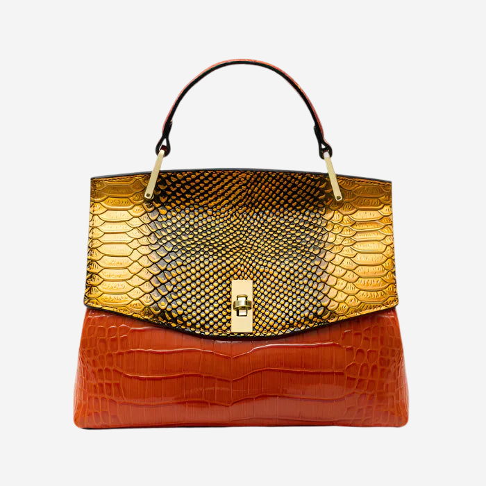 Frigör din elegans med Crocelle – en mångsidig och sofistikerad axelväska för den moderna kvinnan. Med sin ormskinnsinspirerade textur och djärva färgval i livlig lila och intensiv orange blir Crocelle en iögonfallande accessoar som lyfter varje outfit.